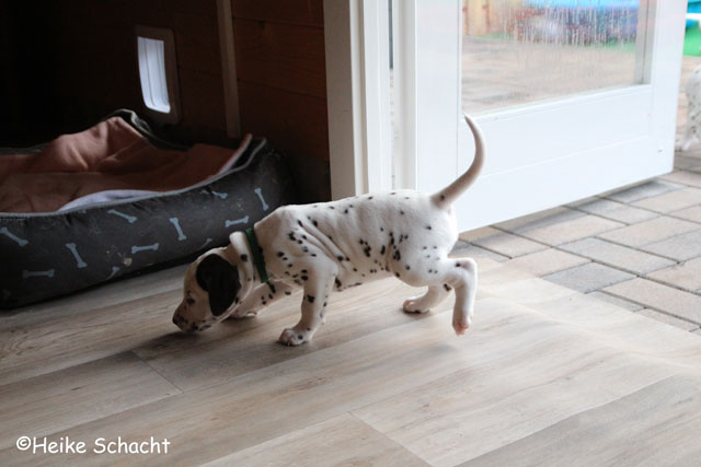 Nach dem Futtern wird das Welpenhaus erkundet und für interessant und schön befunden, alle haben keine Berührungsängste und wandern wie selbstverständlich hinein in die gute Stube....